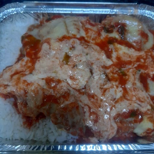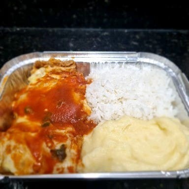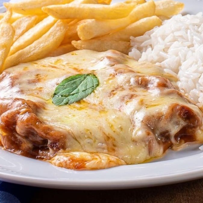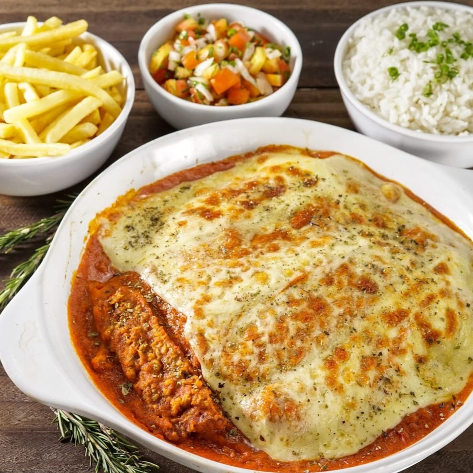 O já conhecido parmegiana da casa, acompanhado de arroz branco e purê de batatas. Tudo acomodado em embalagem retangular de 1150ml. Adicione mais itens em embalagem separada se desejar.