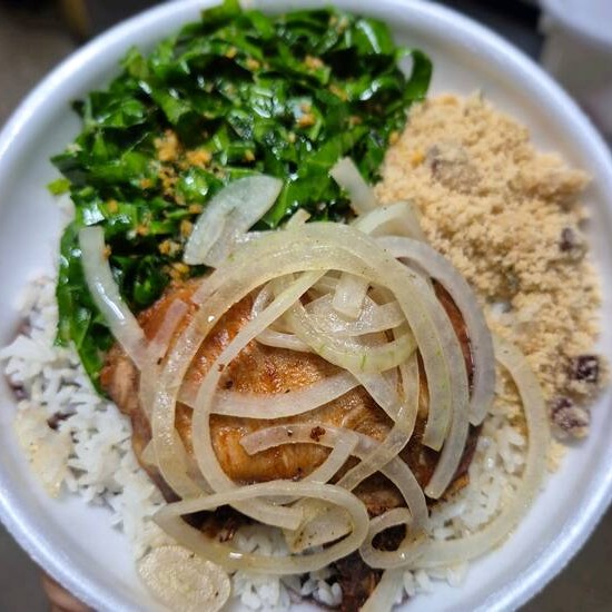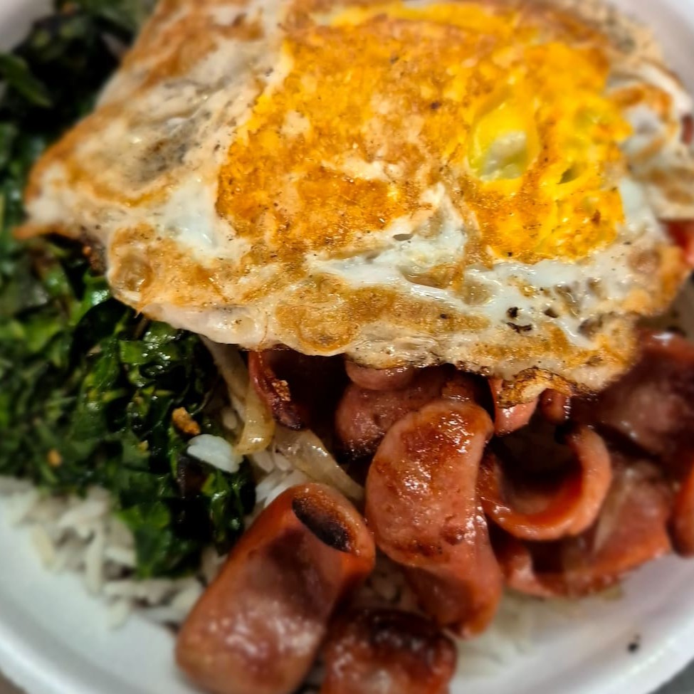 Prato composto de linguiça defumada com toque de azeite e cebola, acompanhado de arroz soltinho, feijão preto, 1 ovo frito no azeite, couve refogada e a garotinha da casa. Uma pedida rápida e com valor justo pra correria do Dia. ***Prato em embalagem 500ml (volume da embalagem)***