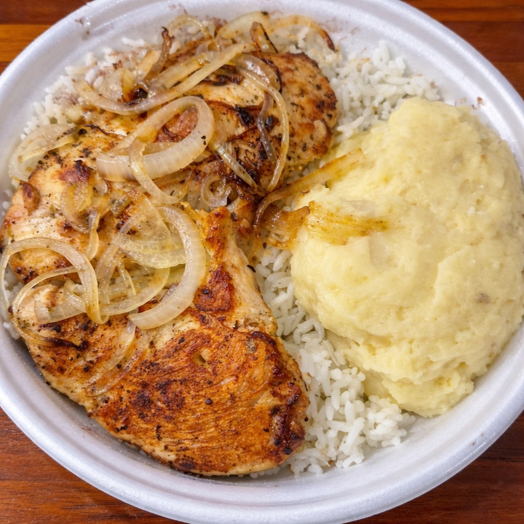 Delicioso filé de frango grelhado com arroz, feijão e purê **Esta opção é para aqueles que comem pouco, pois está em porção de 500ml, não 500gramas*** Imagem Ilustrativa