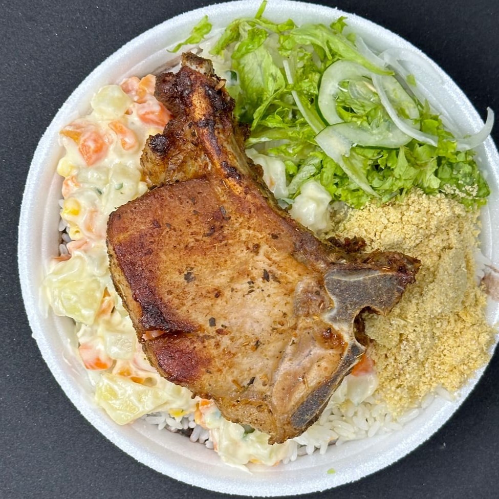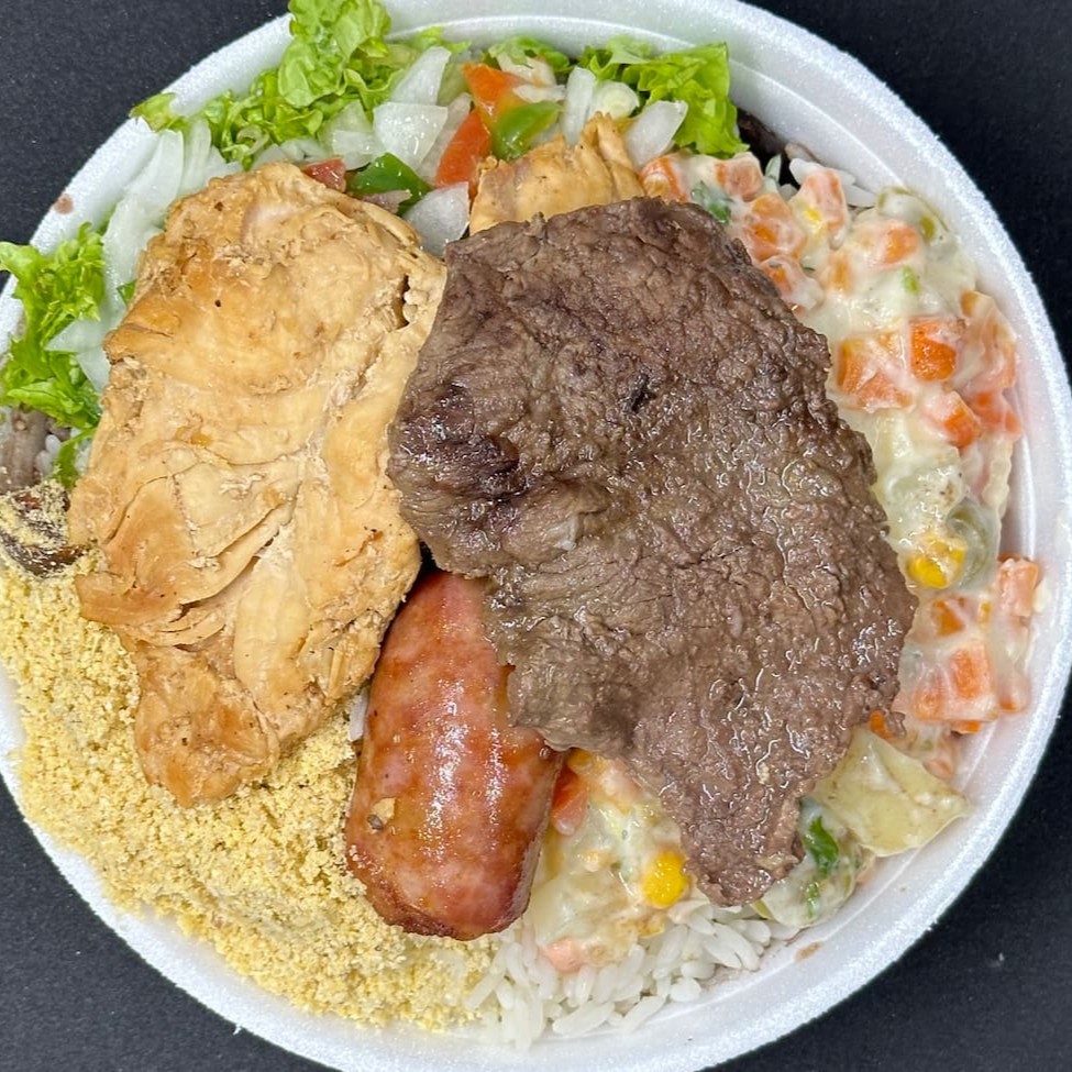 Suculenta e saborosa carne assada, perfeitamente temperada, acompanhada de um irresistível macarrão ao molho. O prato ainda inclui arroz soltinho, feijão fresquinho, uma salada crocante para equilibrar o sabor e uma farofa incrivelmente saborosa para completar essa refeição robusta e cheia de sabor. Uma verdadeira explosão de delícias em um só prato!