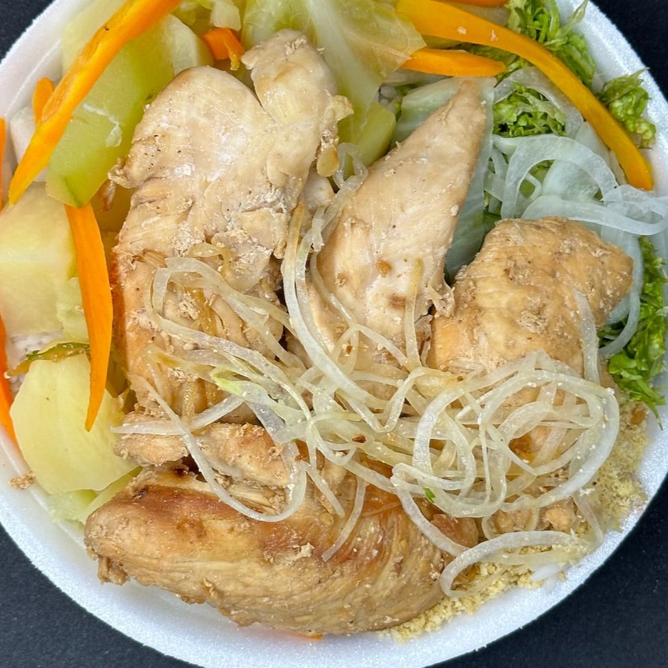 Delicie-se com nosso suculento 'Frango Grelhado com Legumes'. Este prato, cuidadosamente elaborado, apresenta um frango perfeitamente grelhado, exalando aromas convidativos e sabor inigualável. Acompanha uma seleção nutritiva de legumes frescos, adicionando um toque colorido e crocante ao prato. Além disso, oferecemos grãos de arroz bem temperados, feijão caseiro riquíssimo em sabores tradicionais, uma salada fresquinha e vibrante para equilibrar a refeição, e a nossa irresistível farofa crocante. Uma combinação perfeita para uma refeição balanceada e saborosa!