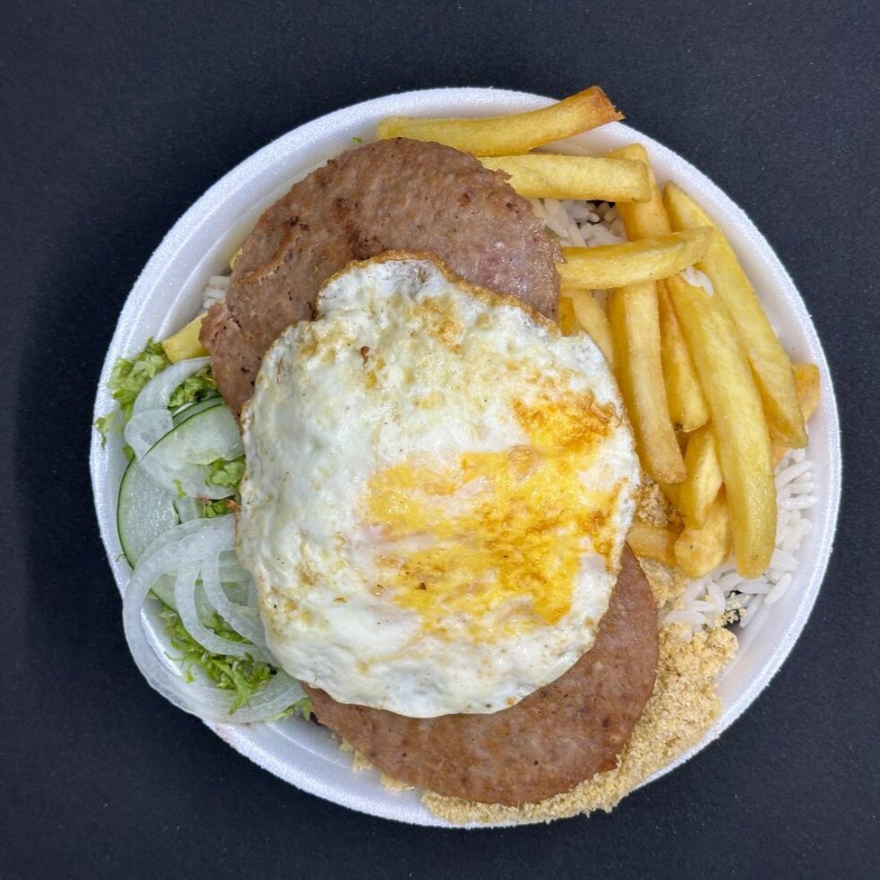 Descubra um verdadeiro deleite para o paladar com o nosso 'Hambúrguer à Cavalo com Fritas'. Este prato robusto é generosamente servido com um hambúrguer suculento, complementado com um ovo frito perfeitamente cozido, proporcionando uma experiência gastronômica irresistível. Acompanha uma porção generosa de batatas fritas crocantes, arroz soltinho, feijão temperado e uma salada fresca e vibrante para equilibrar o prato. Para um toque final adorável, uma farofa crocante e saborosa é adicionada. Uma combinação verdadeiramente vencedora e saborosa para qualquer amante de comida.