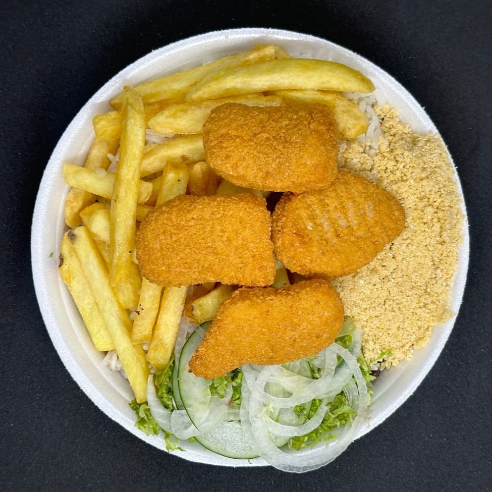 Desfrute de nossos irresistíveis Nuggets de Frango, cuidadosamente preparados e acompanhados por crocantes batatas fritas. Para tornar a sua refeição ainda mais completa e saborosa, o prato conta também com um delicioso arroz fresquinho, feijão temperado no ponto certo e uma salada fresca e colorida. Para finalizar, uma farofa crocante que traz uma textura única ao conjunto. Um prato cheio de sabores e texturas, ideal para uma refeição deliciosa e satisfatória.