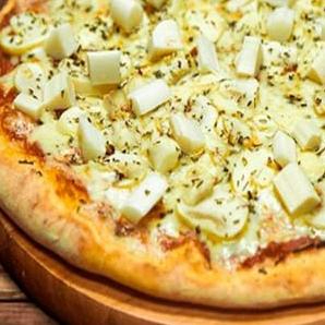 Saborosa pizza com mussarela, frango desfiado e cremoso Catupiry.