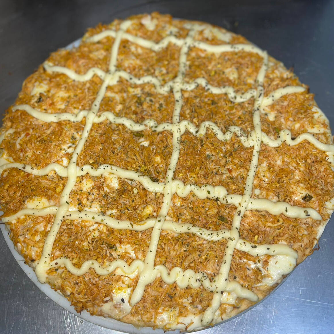 molho, mussarela, frango desfiado, provolone e azeitona