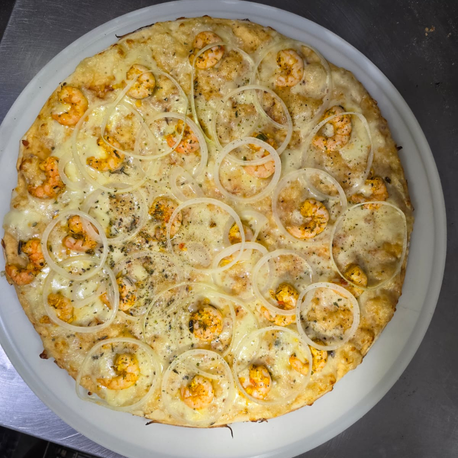 molho, mussarela, camarão, cebola e azeitona