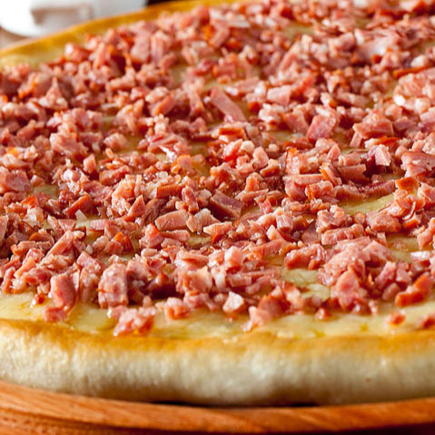 Saborosa pizza de bacon, cebola e azeitona