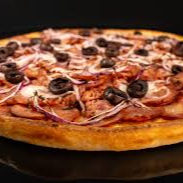 molho, mussarela, presunto, cebola, champignon, parmesão e azeitona