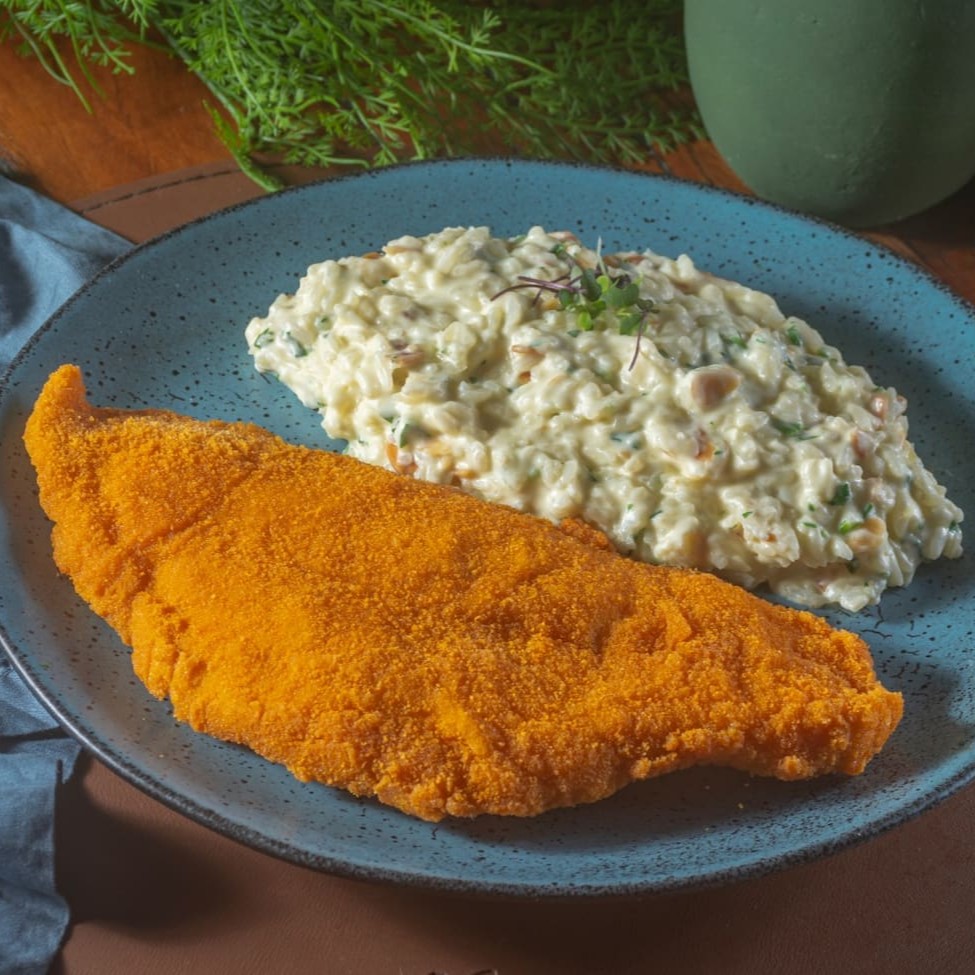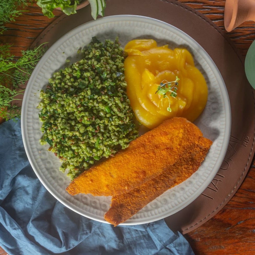 Tilápia empanada no coco - arroz branco e vinagrete de manga