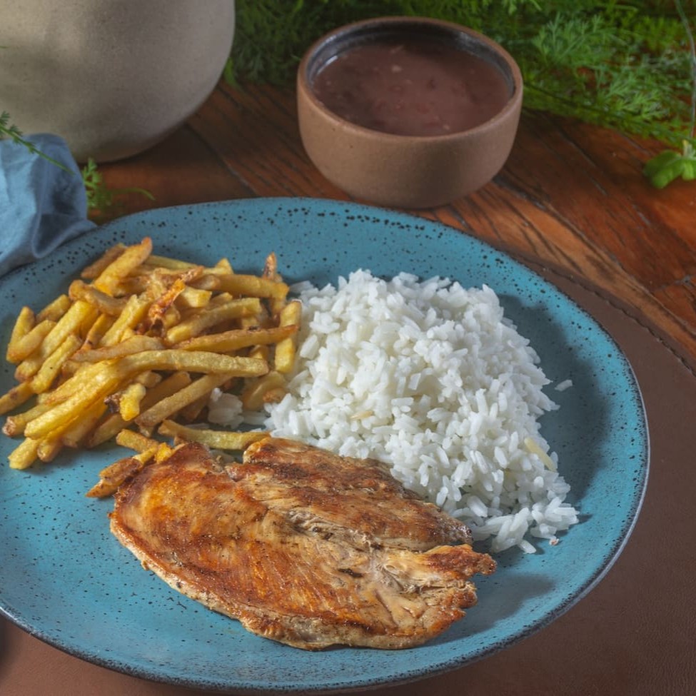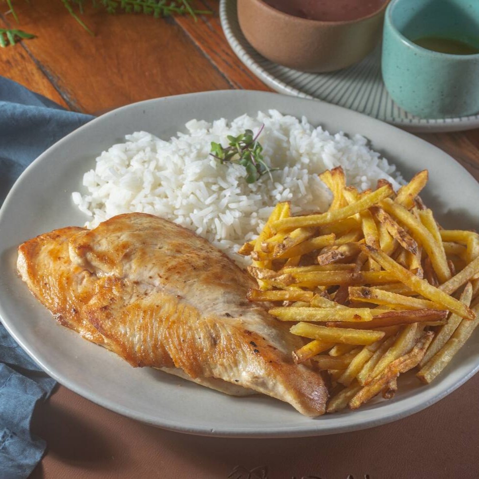 Filezinho de frango grelhado, servido com arroz branco e feijão. Acompanhado por sua escolha de batata frita crocante ou purê de batata cremoso, para uma refeição deliciosa e completa. Aproveite essa maravilha com o Natural!
