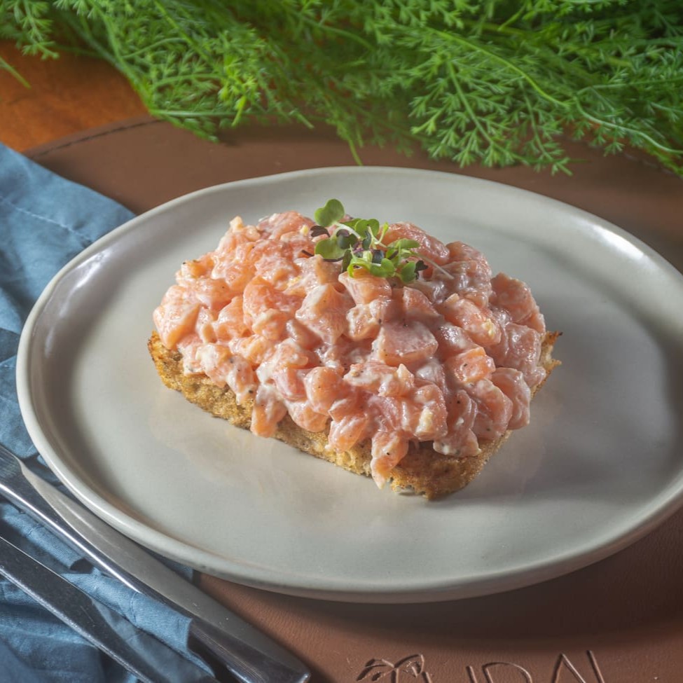 Bruschetta de Salmão com ricota e ervas com muitooo recheio, servida no pão de ervas da casa sem glúten! Aproveite essa maravilha com o Natural!