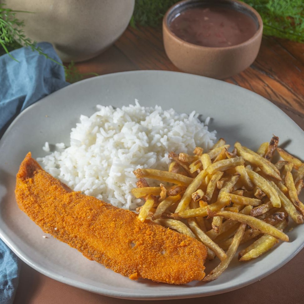 Filé de peixe branco empanado e crocante, servido com arroz branco soltinho e feijão bem temperado. Acompanhe com sua escolha de batata frita crocante ou purê de batata cremoso e suave, para uma refeição deliciosa e completa. Aproveite essa maravilha com o Natural!