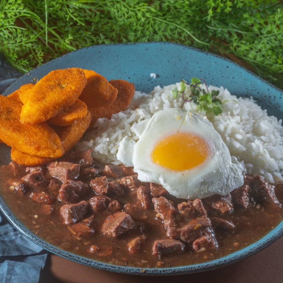 Descubra o sabor autêntico e saudável com nosso Picadinho Natural. Pedaços de filé mignon cozidos, ovo poché, arroz branco e fatias de banana empanada na farinha urucum. Aproveite essa maravilha com o Natural!