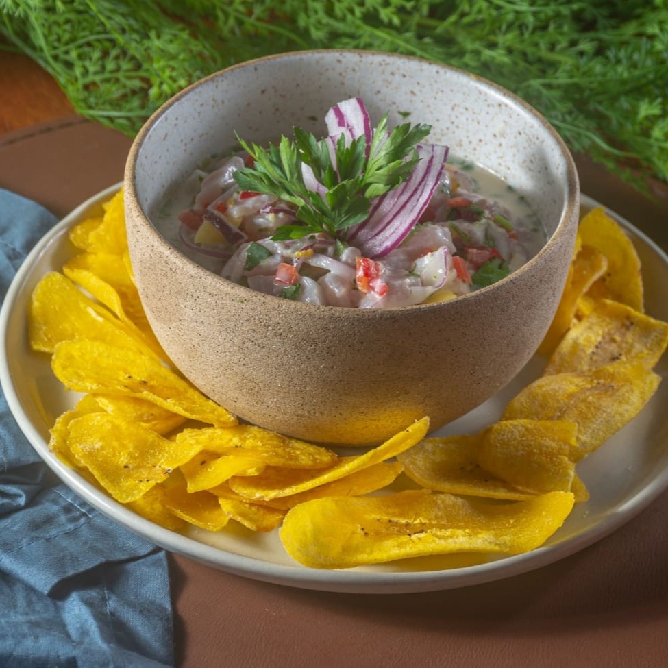 Nosso Ceviche Tailandês, cubos frescos de peixe branco acompanhado chips de banana da terra! Huuuum Opção perfeita para quem busca um prato leve, fresco e com muito sabor. Aproveite essa maravilha com o Natural!