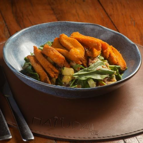 Rúcula, arroz integral, avocado, queijo brie, amêndoa, damasco, cebola roxa com molho especial de laranja e iscas de tilápia