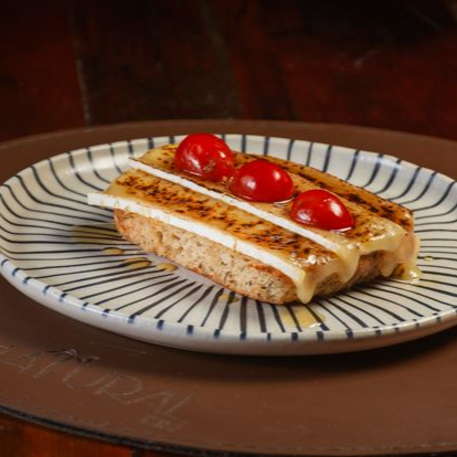 Brusqueta no pão de ervas sem glutem, de queijo brie com tomate confitado e mel trufado