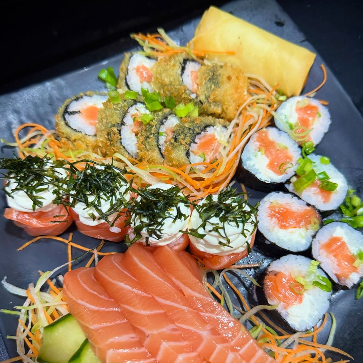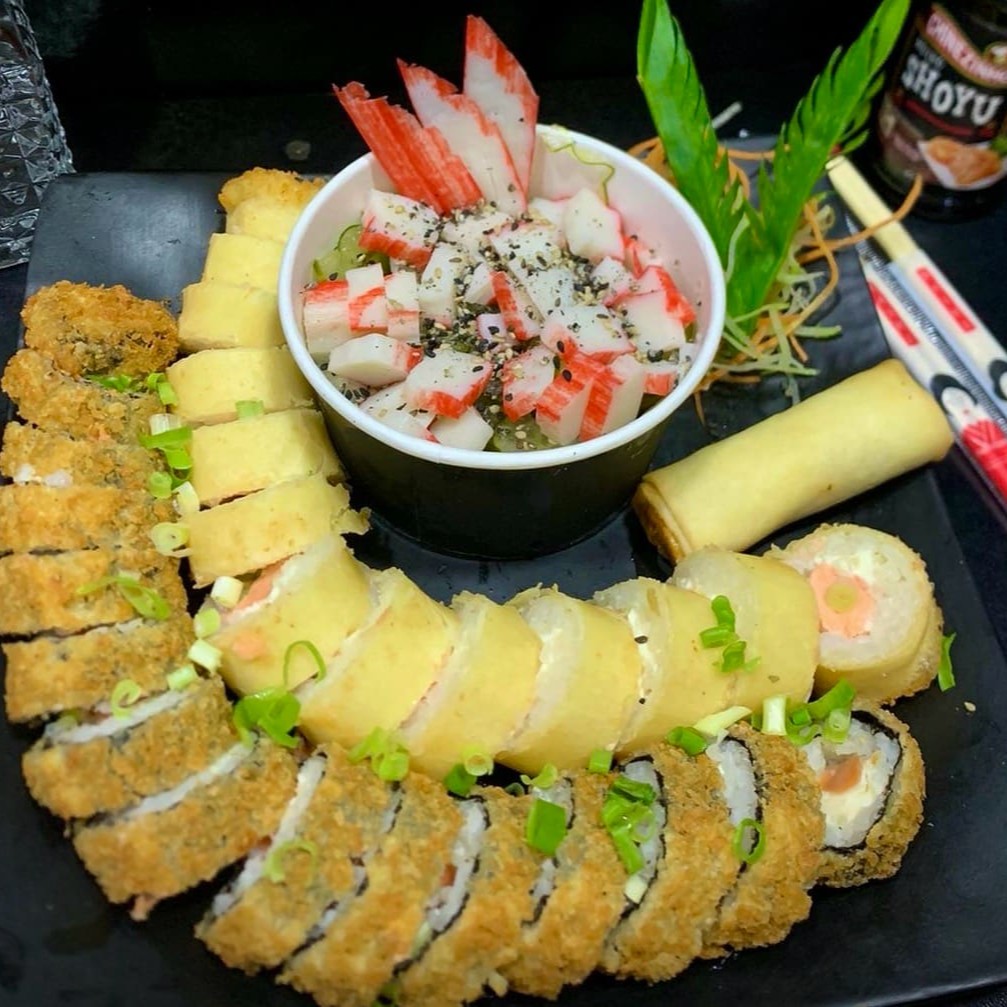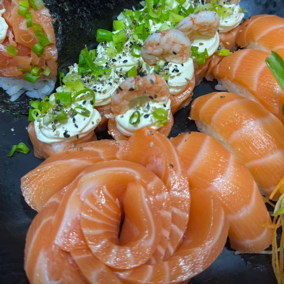 6 Hot Philadelfia + 4 Joe Joe com Alho Poró Crispy + 4 Sashimi Salmão + 6 Philadelfia Roll + 1 Harumaki de Doce de Leite