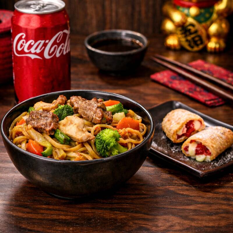 Yakisoba Misto + Coca + Harumaki Romeu e Julieta Yakisoba misto bem servido, com legumes frescos e carnes no ponto certo. Acompanha Coca-Cola gelada e harumaki crocante recheado com goiabada e cream cheese. Do salgado ao doce na medida perfeita.