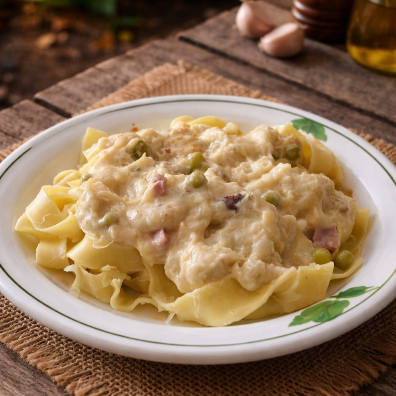 Nosso fettuccine artesanal, com delicioso molho parisiense, molho branco com frango desfiado, cubos de presunto e petit poa. Serve 1 pessoa, aproximadamente 470g.