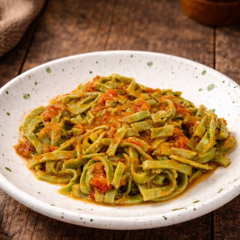 Apresentamos nosso fettuccine ao sugo (molho de tomate). Nossa massa caseira e artesanal acompanhado de um delicioso molho ao sugo bem consistente. Serve 1 pessoa, aproximadamente 450g.