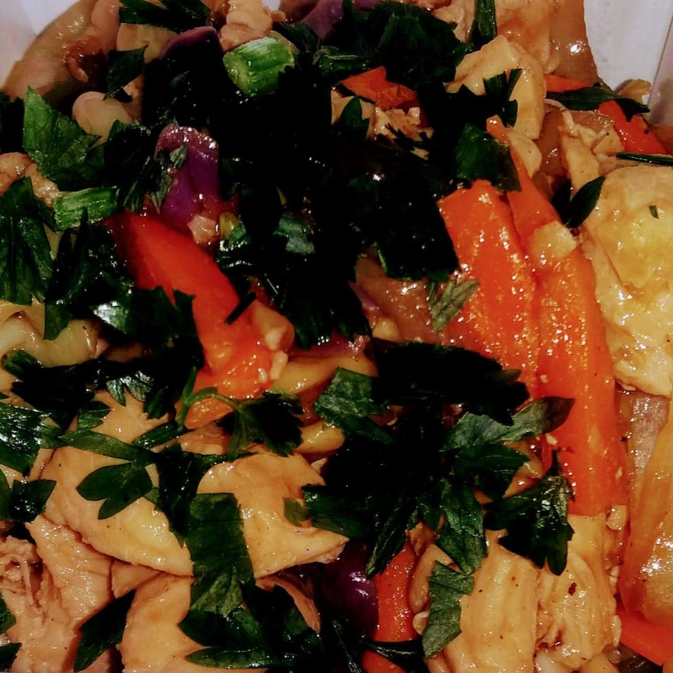 Macarrão Especial, Repolho Roxo, Repolho Verde, Pimentão Vermelho, Pimentão Verde, Pimentão Amarelo, Cenoura, Brócolis, Couve-flor, Cebola, Salsa e Cebolinha, Frango e Molho Shoyu.