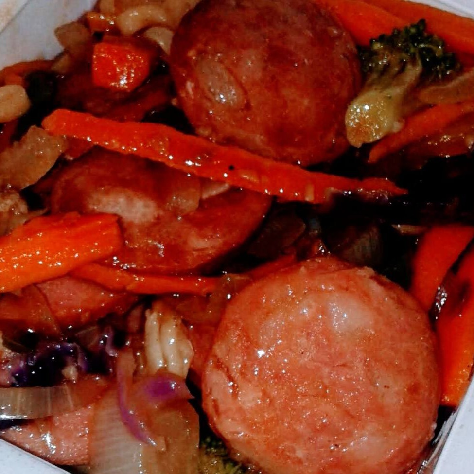 Macarrão Especial, Repolho Roxo, Repolho Verde, Pimentão Vermelho, Pimentão Verde, Pimentão Amarelo, Cenoura, Brócolis, Couve-Flor, Cebola, Salsa e Cebolinha, Calabresa e Molho Shoyu