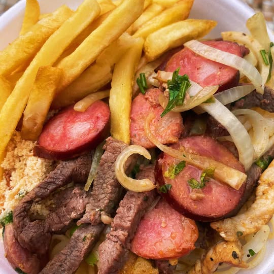 Acompanha arroz, feijão, macarrão, farofa, e fritas