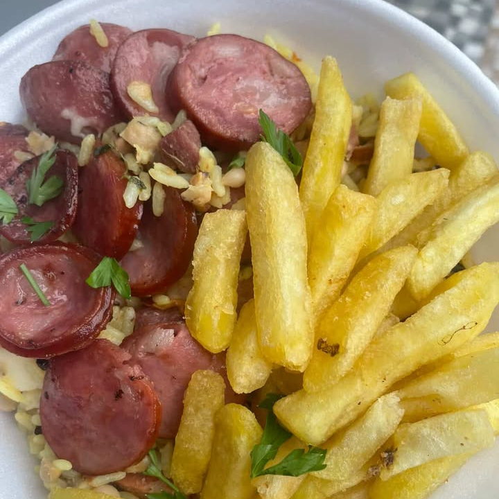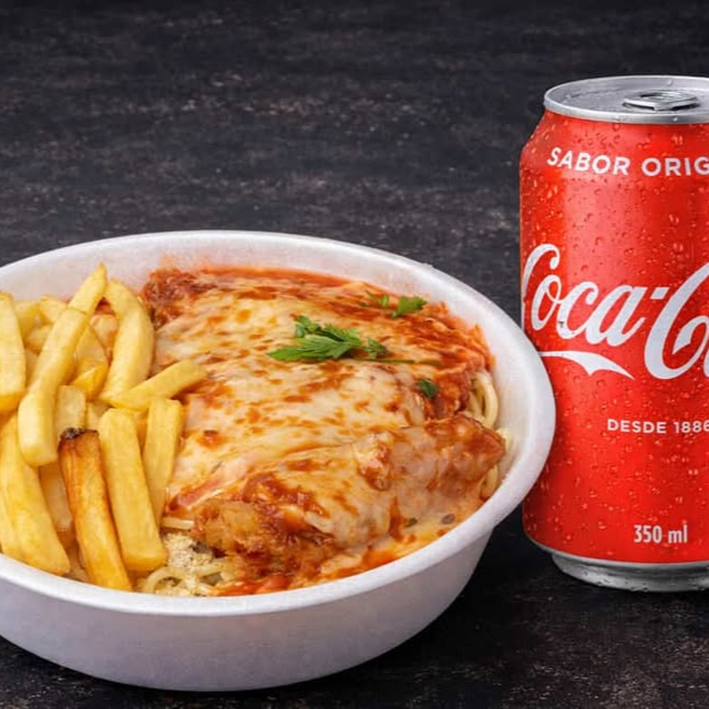 Acompanha arroz, feijão, macarrão, farofa e fritas