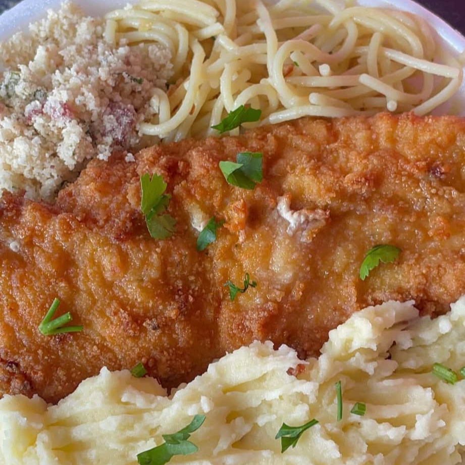 Acompanha arroz, feijão, macarrão, farofa, fritas e salada