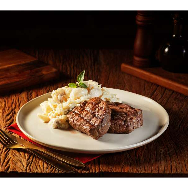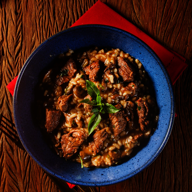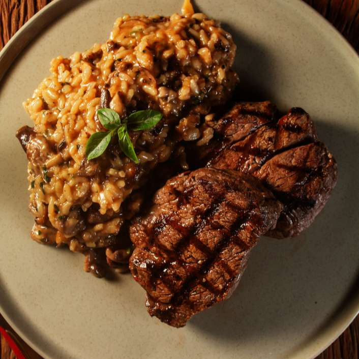 Arroz arbóreo cozido lentamente com cogumelos frescos e secos, finalizado com parmesão e servido com suculentos medalhões de filé mignon grelhados.