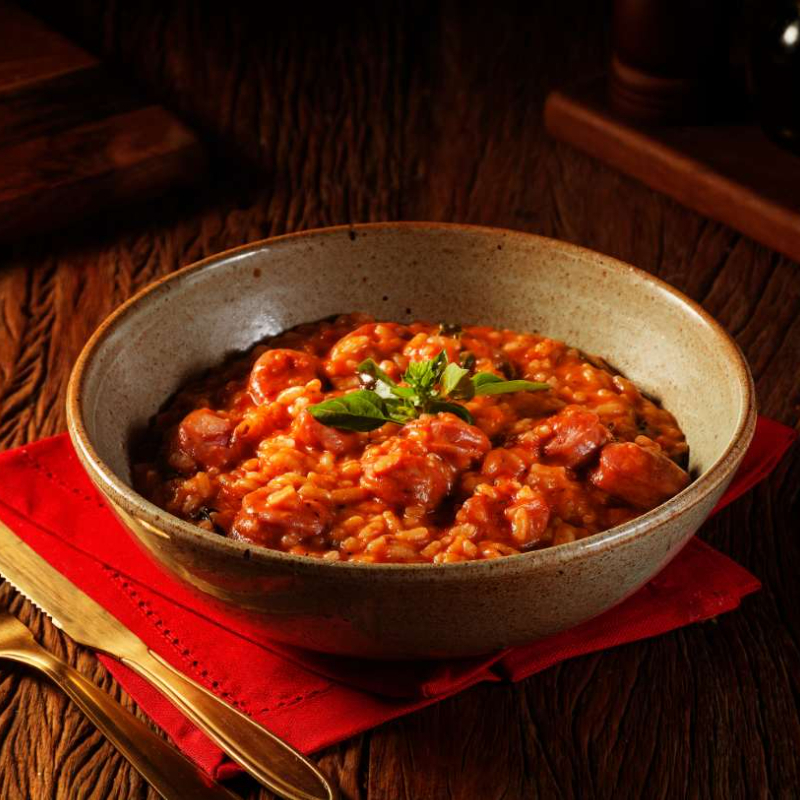 Risotto com calabresa, tomate e manjericão, trazendo os sabores típicos da Toscana. Comida Italiana, Restaurante Italiano, Massas Artesanais, Culinária Italiana, Massas Frescas, Penne, Espaguete, Gnocchi, Risoto De Salmão, Polenta Italiana, Frango Parmegiana, Salmão Grelhado, Bruschetta Italiana, Batata Frita Crocante, Coca Cola, Guaraná Antártica, Entrega Gratis, Delivery De Massas.