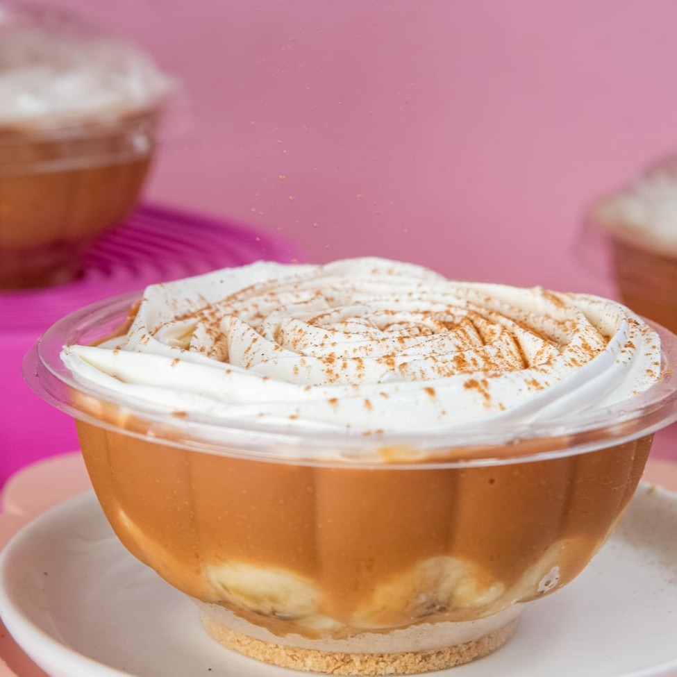 Experimente o irresistível Banoffe da Vovó! Nosso campeão de vendas traz a crocância da farofa de biscoito de maisena, rodelas de banana fresquinhas e um doce de leite premium, tudo finalizado com um toque especial de chantilly e canela. Delícia pura!