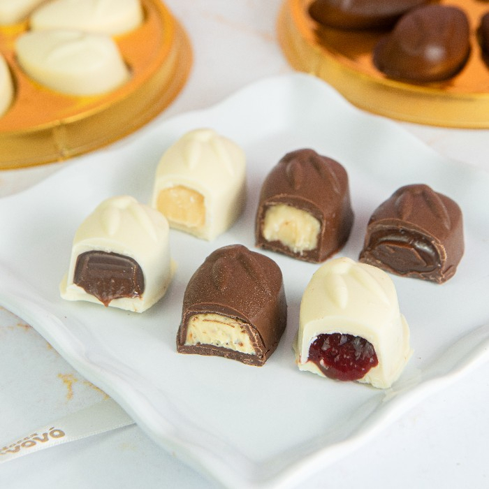 A caixa contém 6 bombons generosamente recheados nos seguintes sabores: Maracujá (casca de chocolate blend), Prestígio (casca de chocolate blend), Geleia de morango (casca de chocolate branco), Brigadeiro de chocolate (1 de chocolate blend e 1 de chocolate branco) e Brigadeiro branco (casca de chocolate branco).