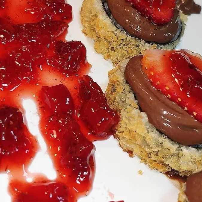 Morango com geleia de morango, arroz, alga empanada no panko e chocolate.