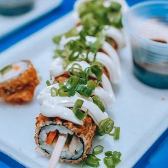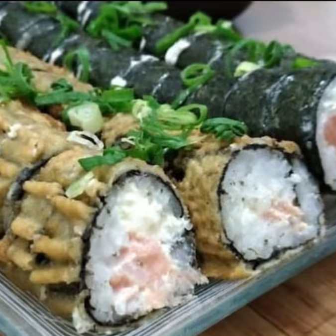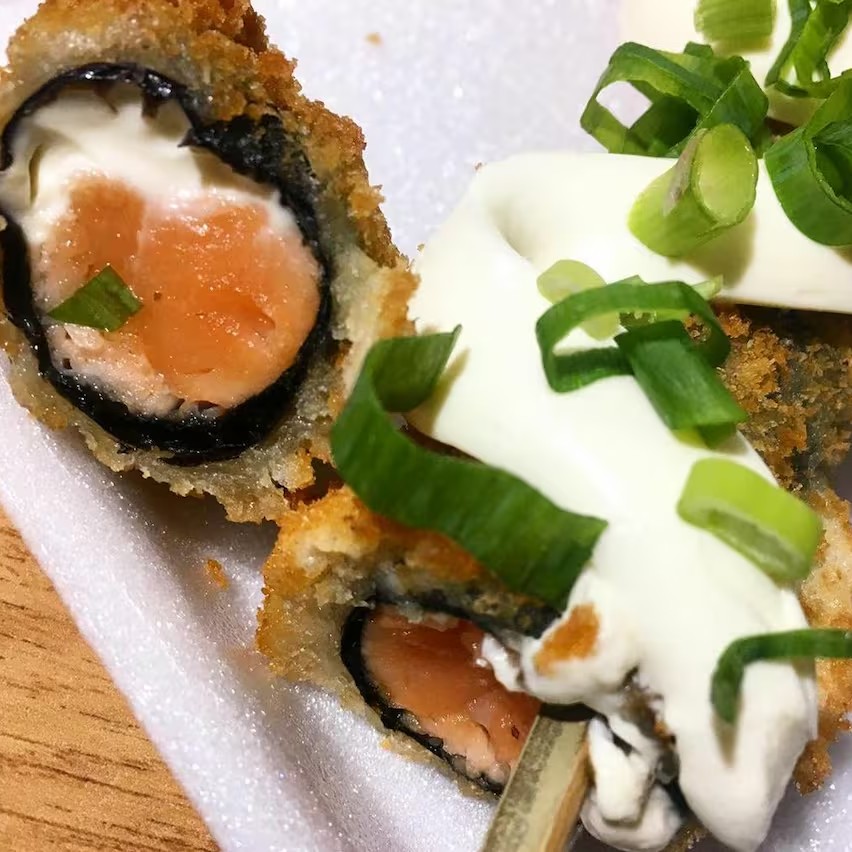Arroz japonês e cream cheese envoltos em uma lâmina de salmão com cobertura de alho poró frito.