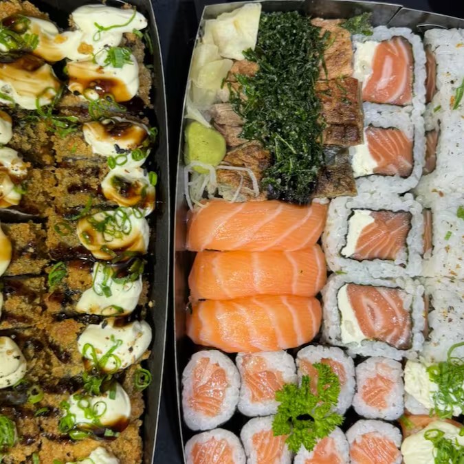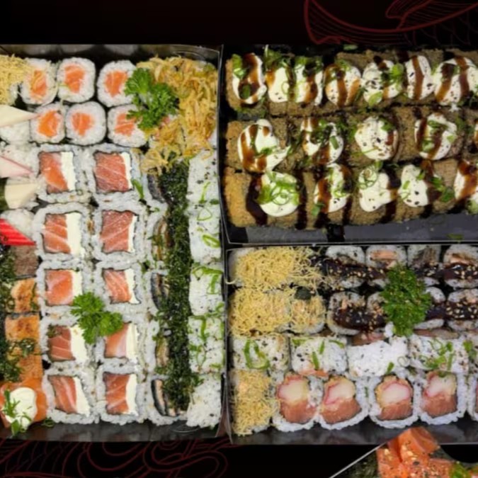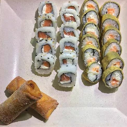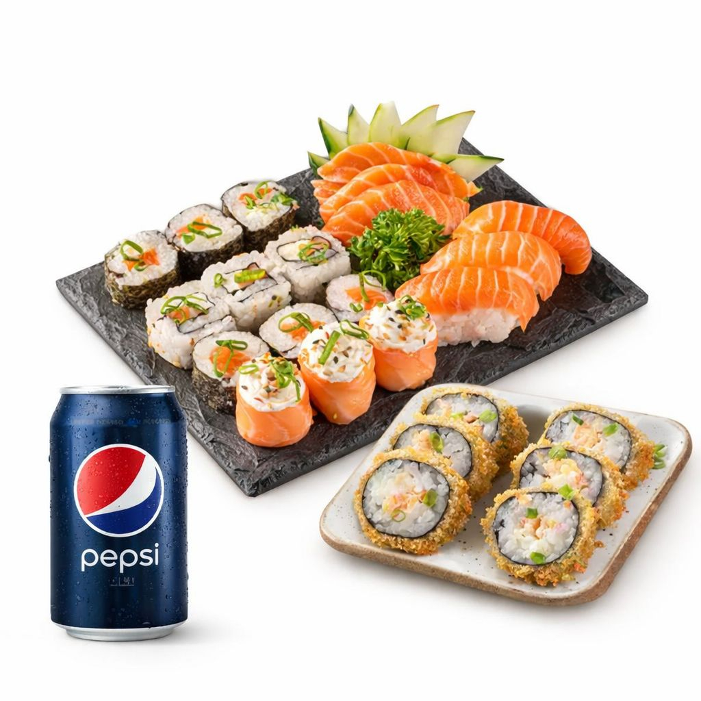 6 sashimis de salmão + 6 sashimi de atum + 6 Sashimi peixe branco + 12 hot crocante + 06 philadelfia roll + 06 skin roll + 05 joe joe + 2 harumakis de doce de leite + 2 Cocas lata.