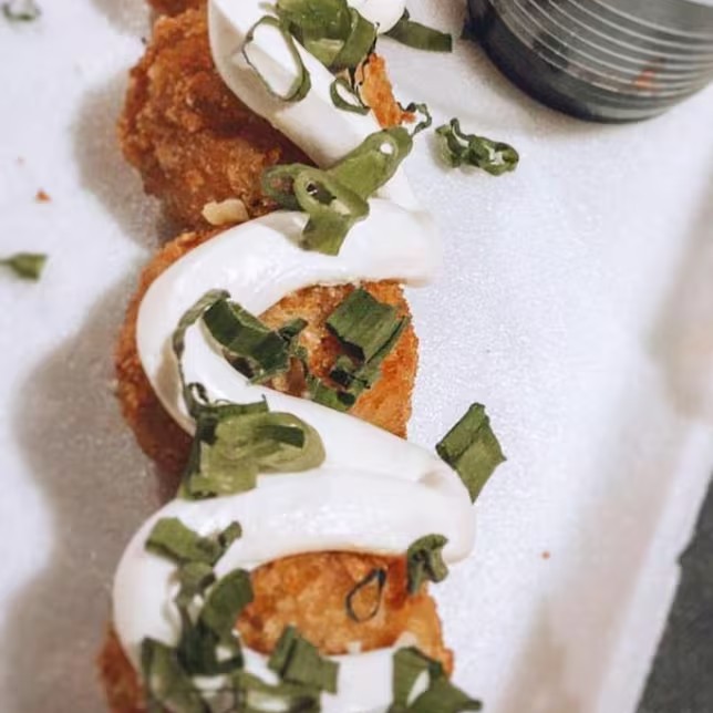 6 hots crocantes de salmão com cobertura de cream cheese e camarão e 1 temaki Philadelphia de camarão. Acompanhado com um molho teriaky feito na hora como cortesia da casa.