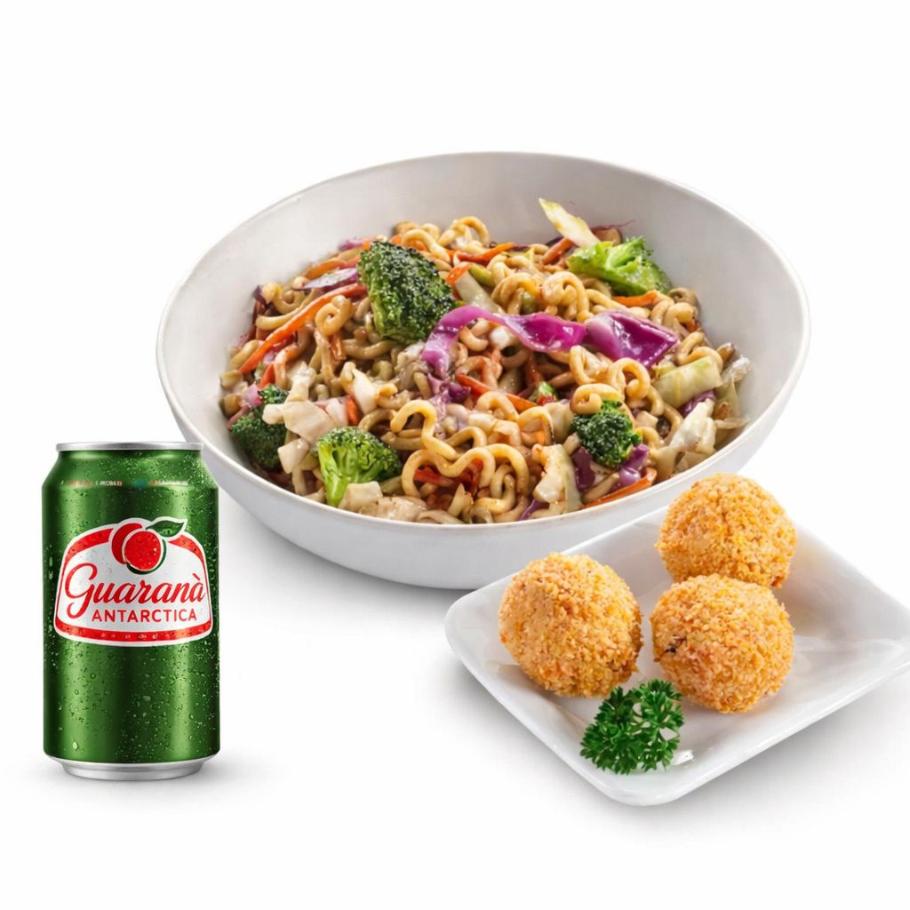 Croc Ball (3 unidades) + Yakisoba Misto 250g: Massa pra yakisoba, carne, frango, repolho verde, repolho roxo, cenoura, acelga, brócolis, molho shoyu, tonkatsu, hondashi, ajinomoto, alho e óleo de gergelim. + Bebida Grátis