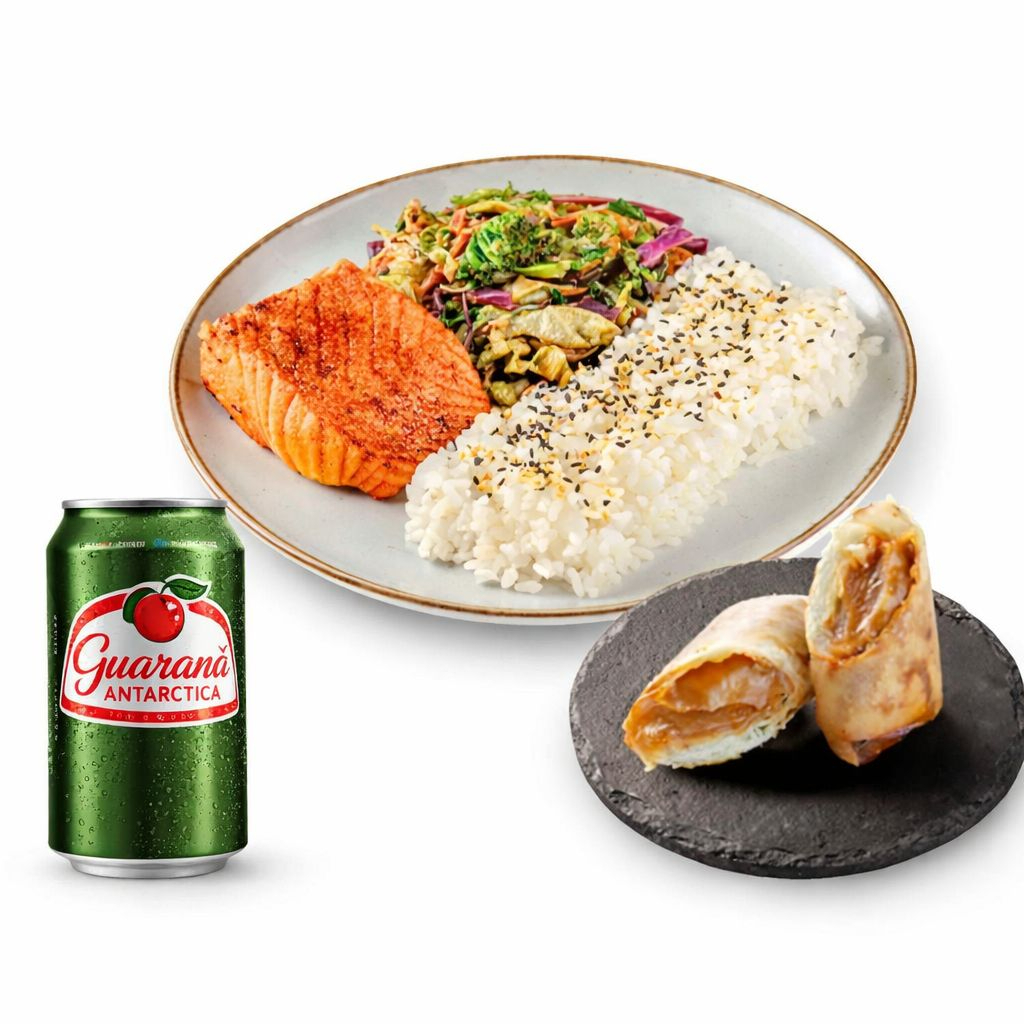 Bentô de Salmão: Filé de salmão grelhado, arroz temperado e legumes salteados. + Harumaki Doce de leite: Massa de harumaki com recheio de Doce de Leite. +Bebida Grátis