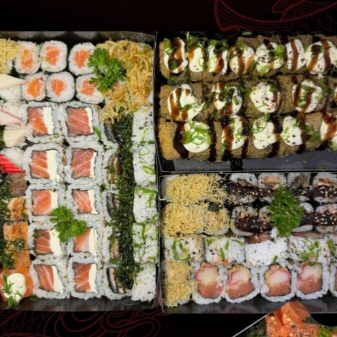 16 sashimis de salmão + 12 hot crocante + 06 philadelfia roll + 06 skin roll + 05 joe joe + Teryaki