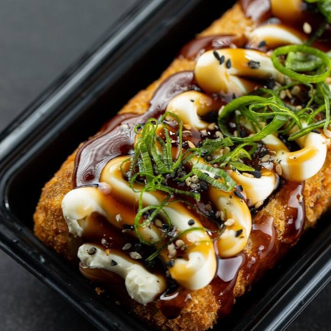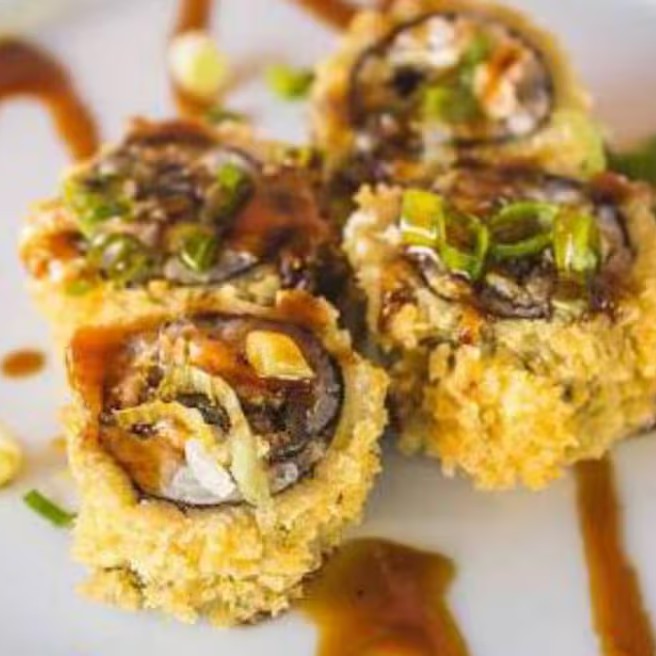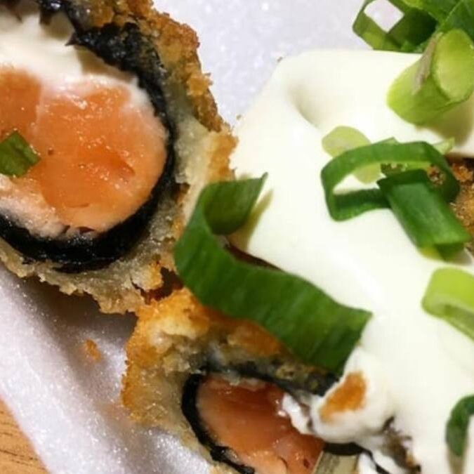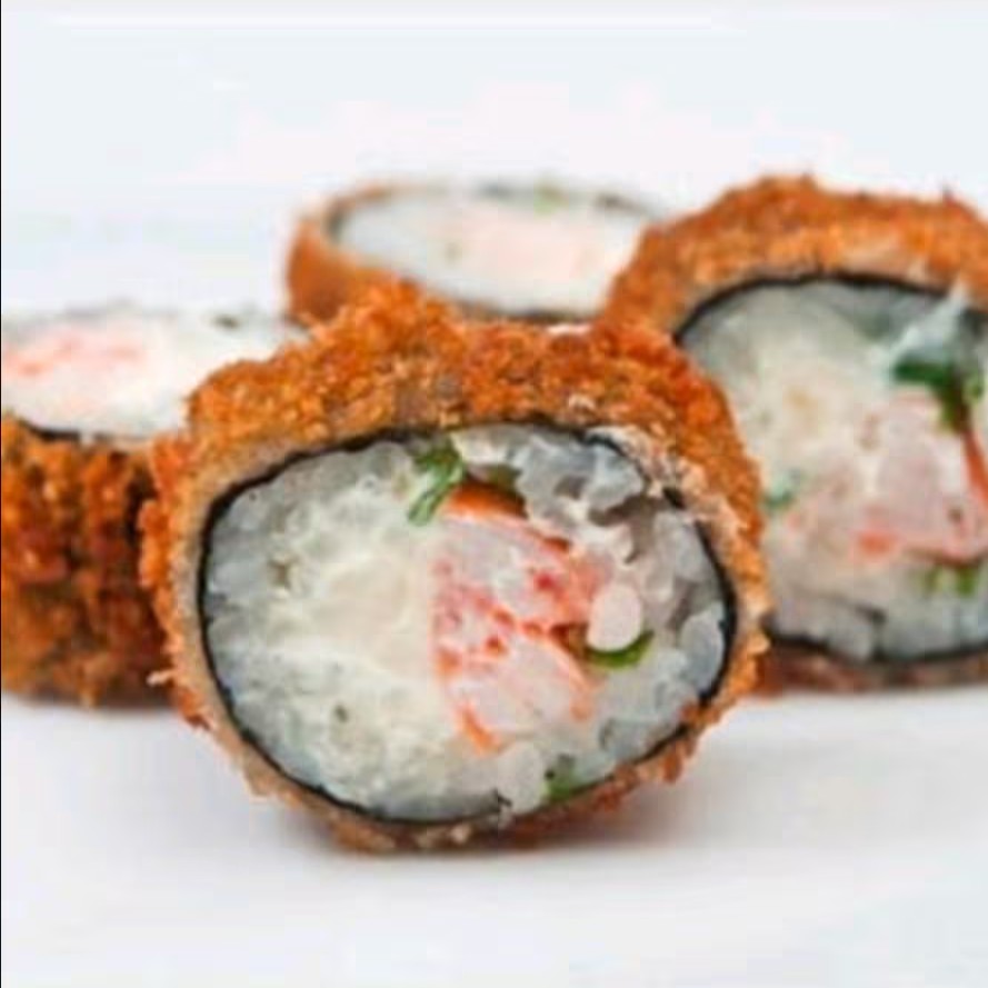 Salmão, arroz, alga, cream cheese, empanado na Panko e frito, Experimente esse sabor!