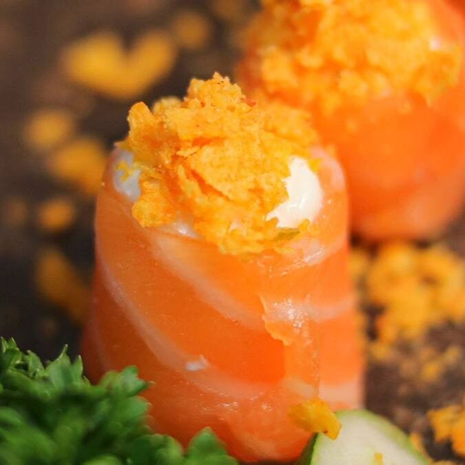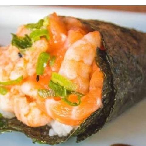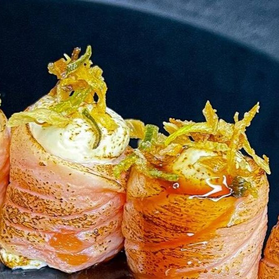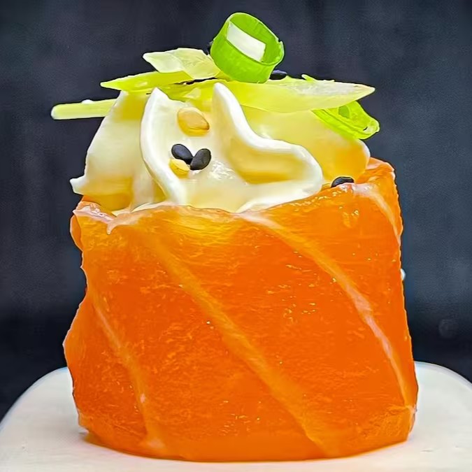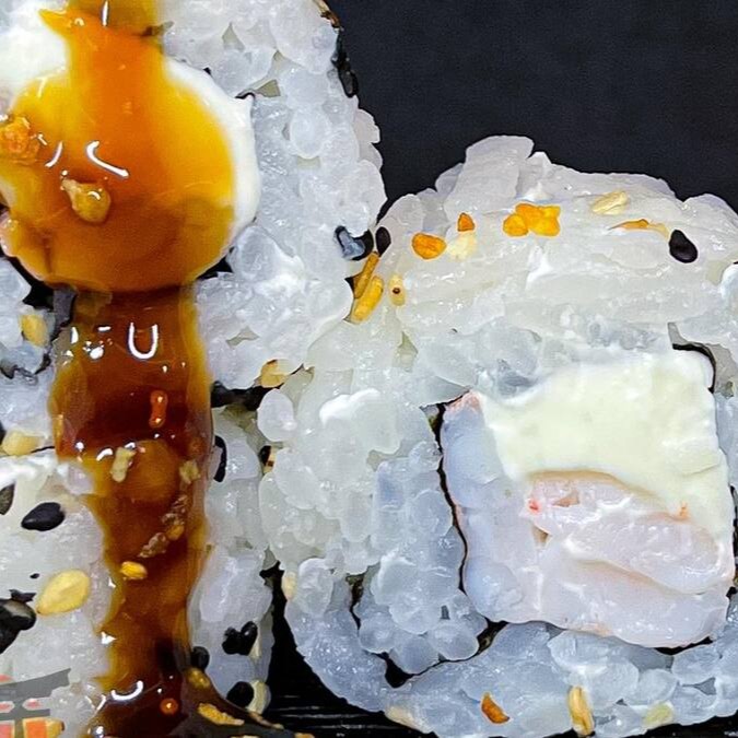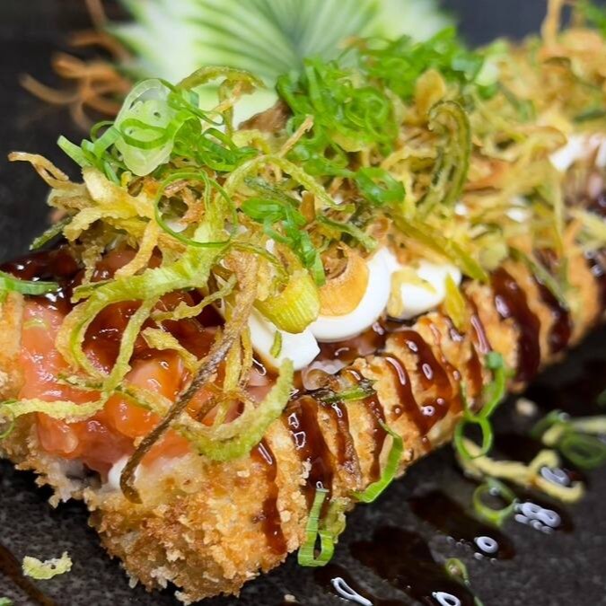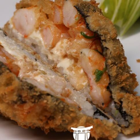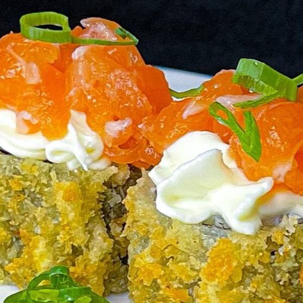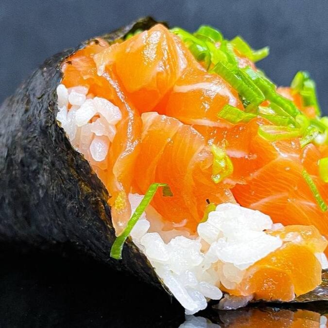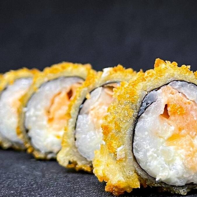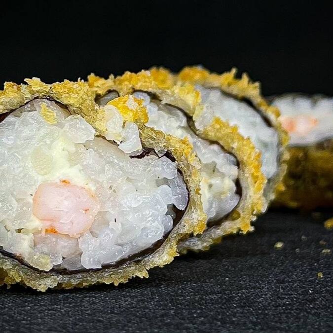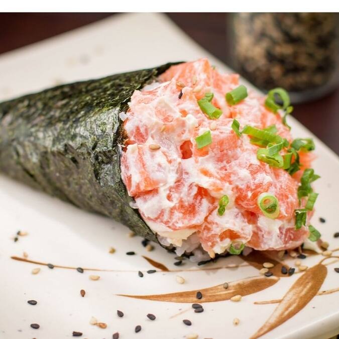 Makimono crocante de arroz e cream cheese, empanado e frito, cortado ao meio e coberto com cream cheese, cubos de salmão fresco, molho teriyaki, alho-poró e cebolinha. Uma explosão de texturas e sabores porção com 1 unidade.