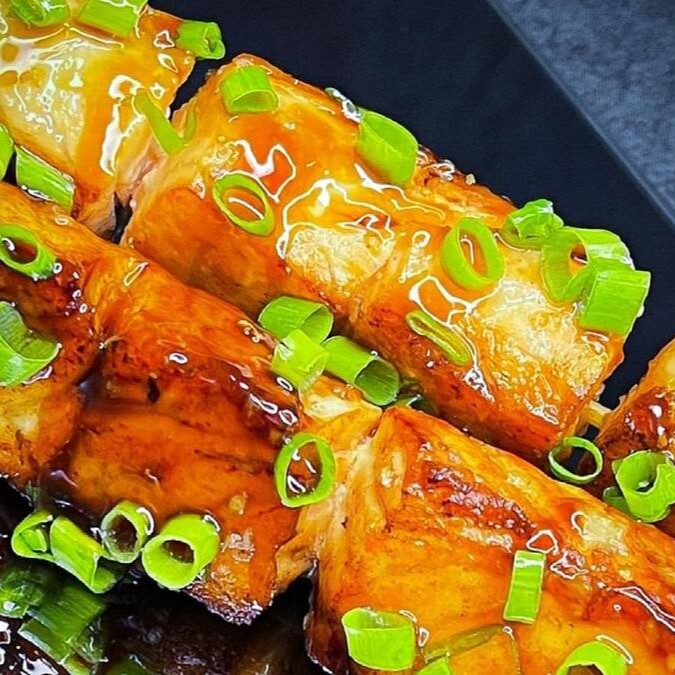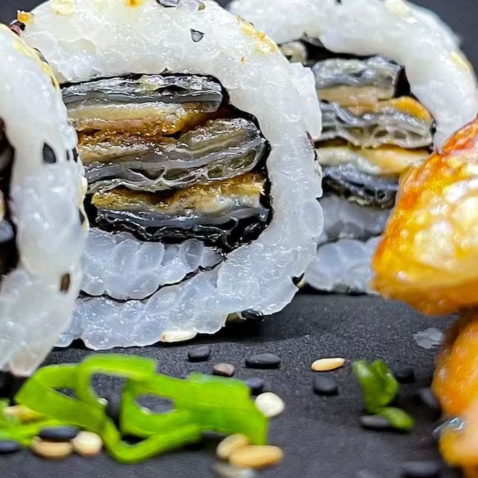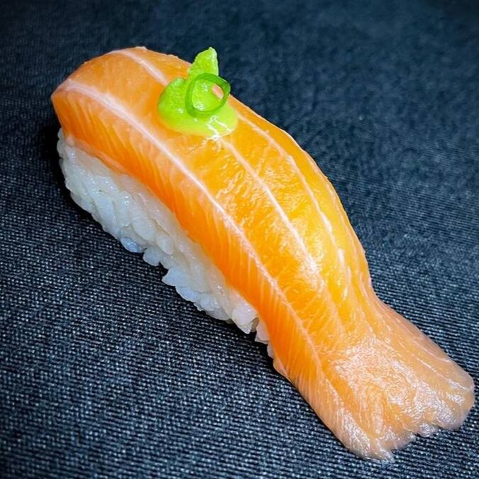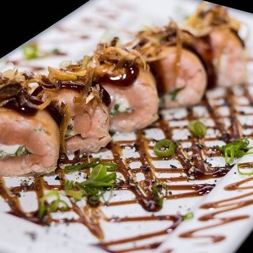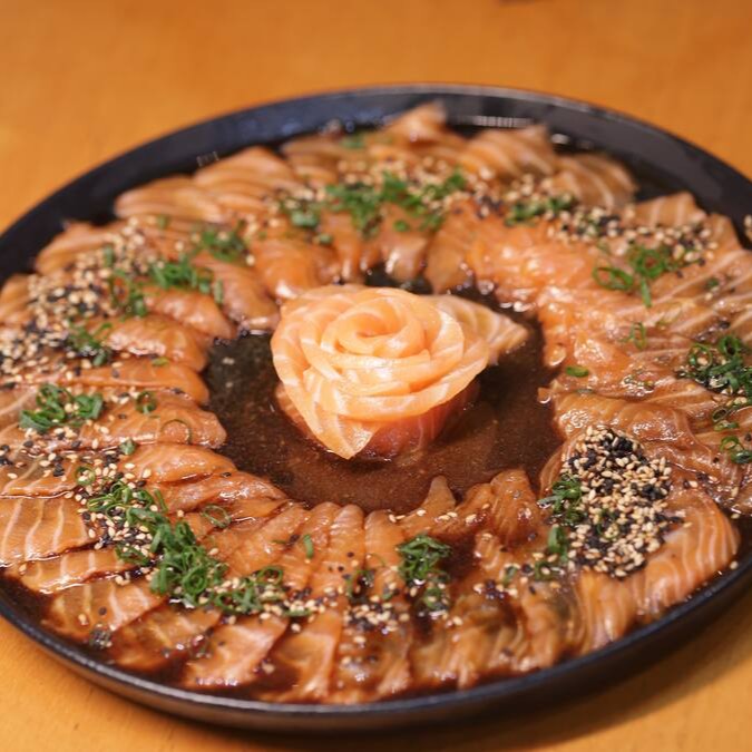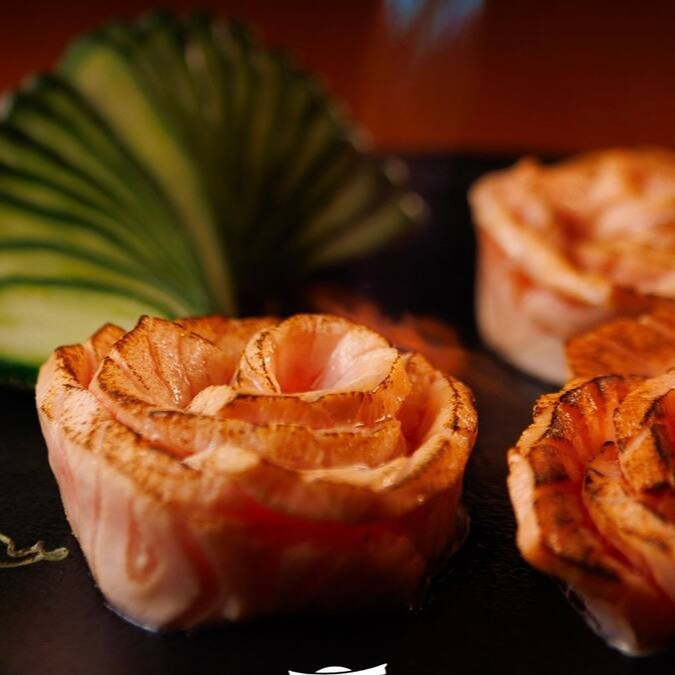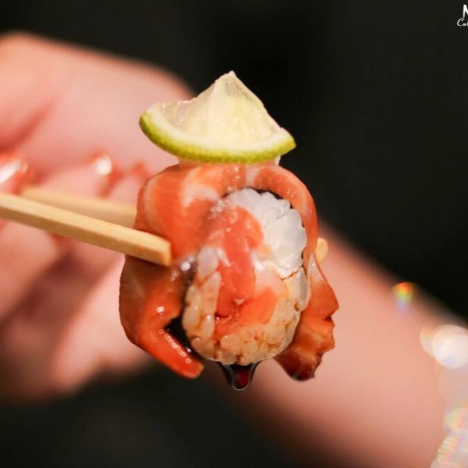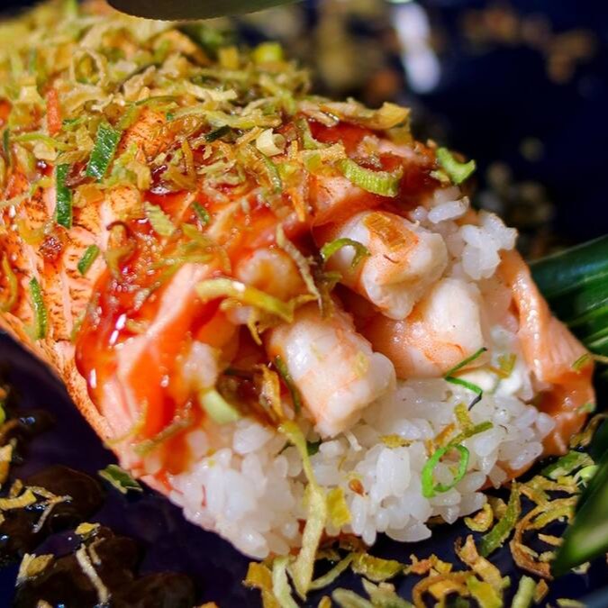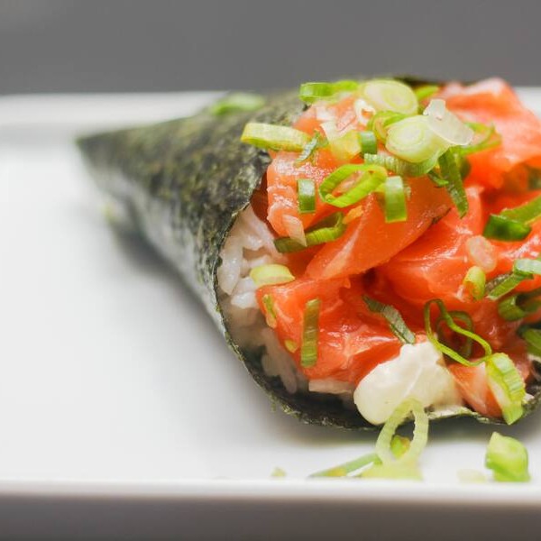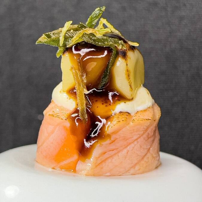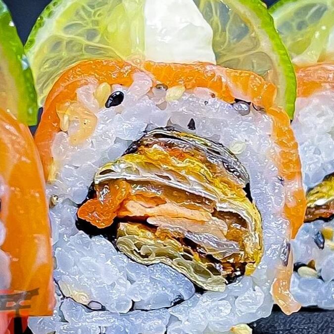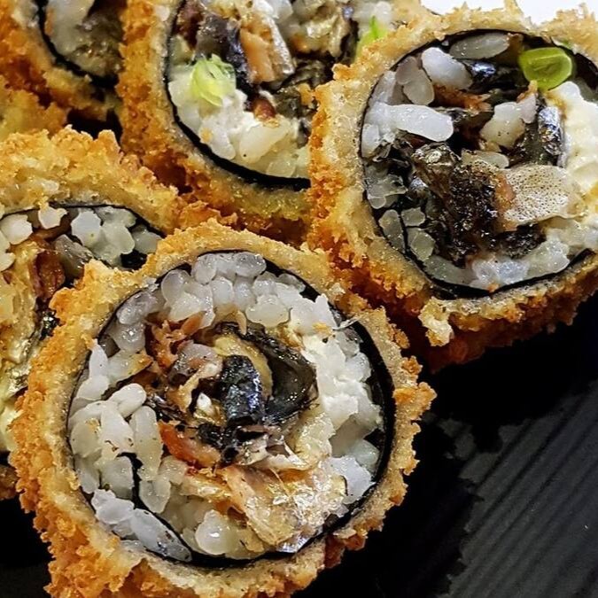 Makimono crocante de arroz e cream cheese, empanado e frito, cortado ao meio e coberto com cream cheese, cubos de salmão fresco, molho teriyaki, alho-poró e cebolinha. Uma explosão de texturas e sabores porção com 1 unidade.