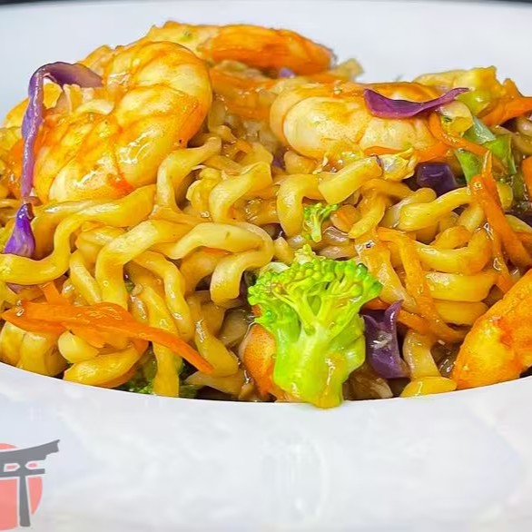 Macarrão japonês salteado com camarão e legumes frescos, temperado na medida certa, leve, suculento e cheio de sabor. - peso aproximado exceto seja opção "sem vegetais"