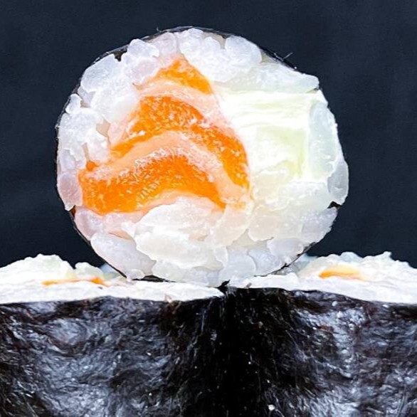 Makimono enrolado em alga com recheio simples de peixe fresco, cream cheese e finalizado com fina lamina de salmão, sabor delicado. - porção com 10 unidades Acompanha 2 molhos: teriaki e shoyu.