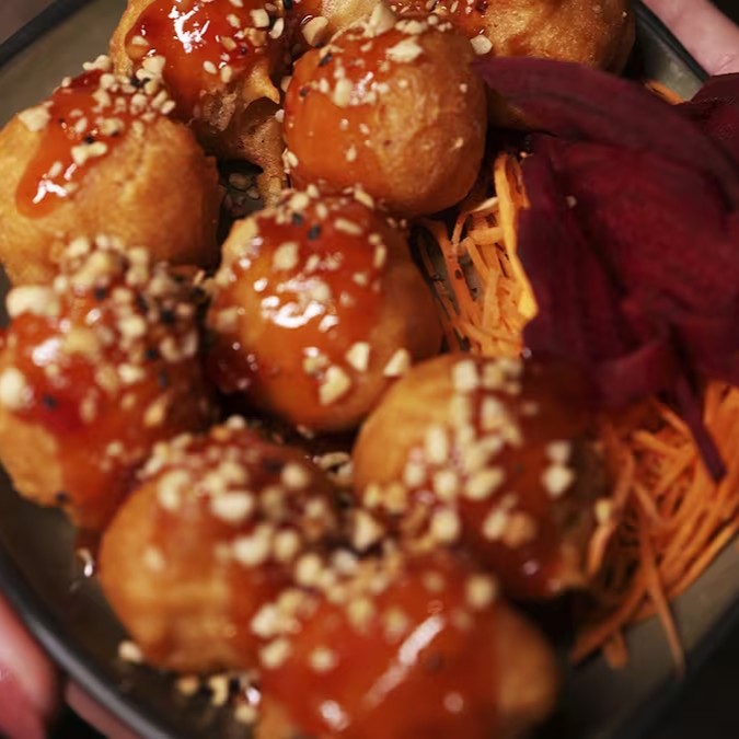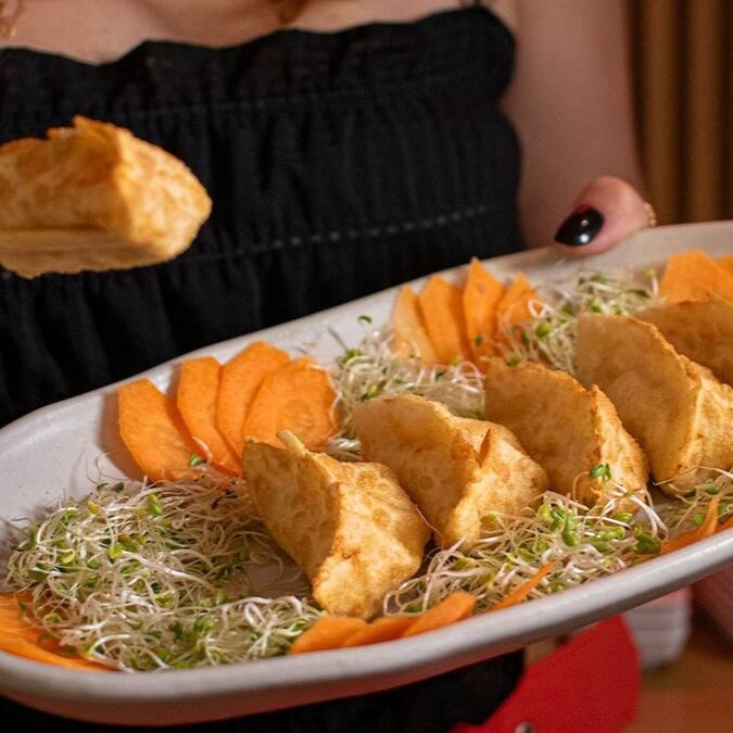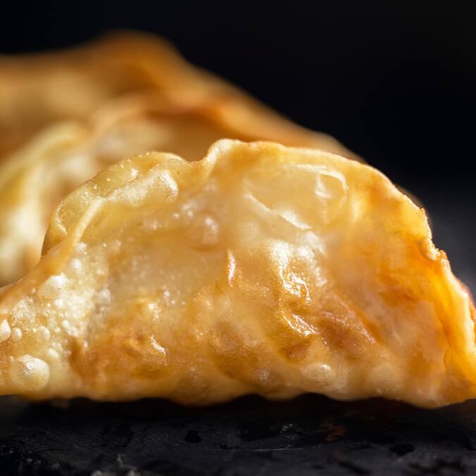Delicados pastéis japoneses recheados com camarão, catupiry e alho-poró, saborosos e cremosos. - porção com 6 unidades