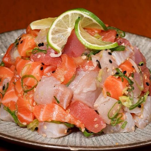 Cubos de salmão, atum bluefin, camarão e peixe branco, finalizadas com cebolinha e gergelim. - peso aproximado 250 gramas