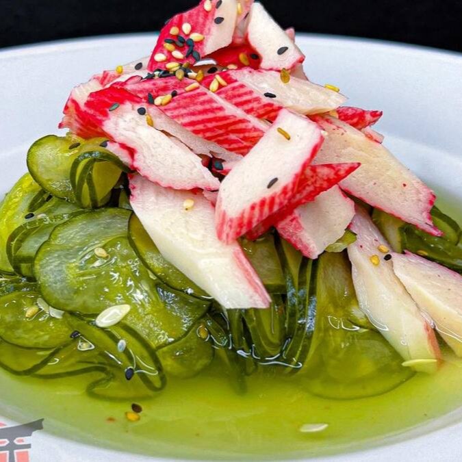 Salada japonesa de pepino em molho agridoce de vinagre de arroz, finalizada com kani e gergelim. - peso aproximado 250 gramas