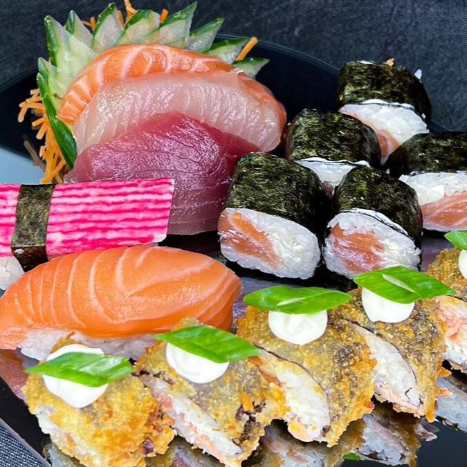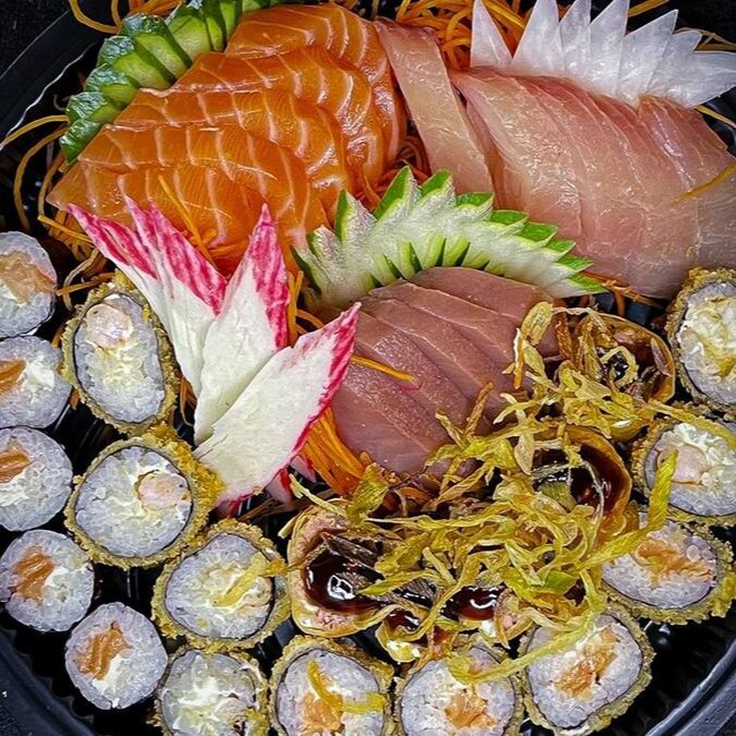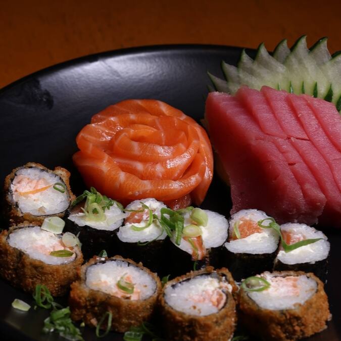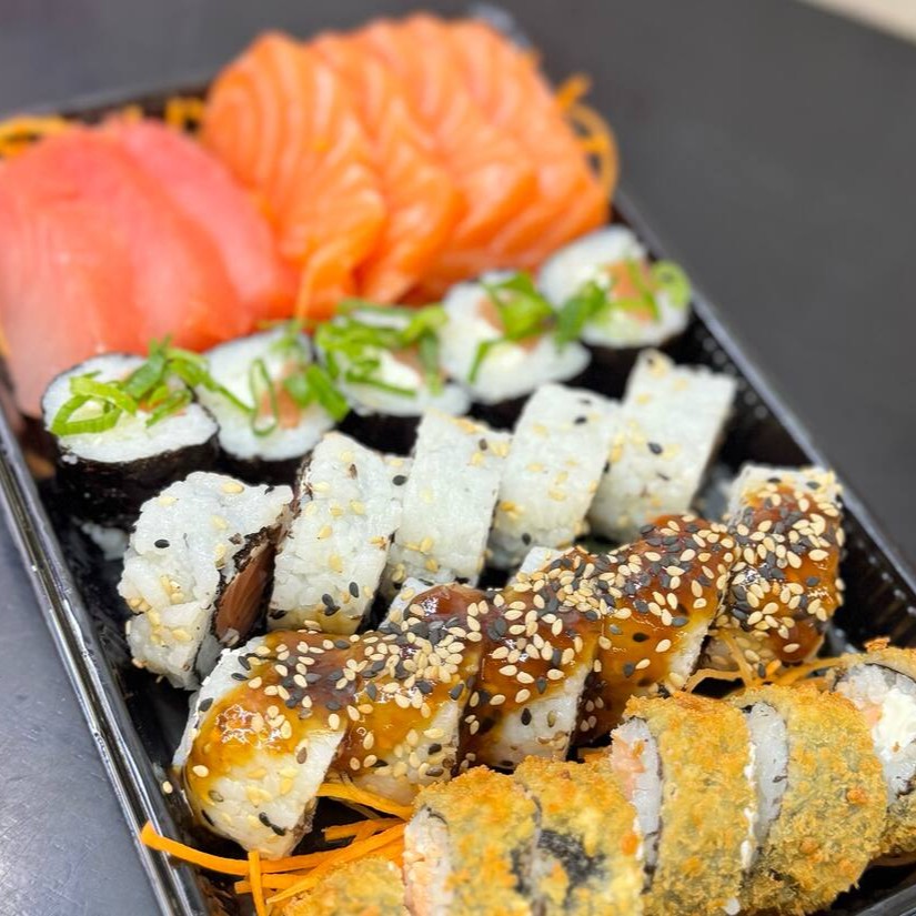 5 sashimi salmão, 3 sashimi atum, 4 filadélfia, 4 uramaki skin, 4 califórnia, 5 hot filadélfia