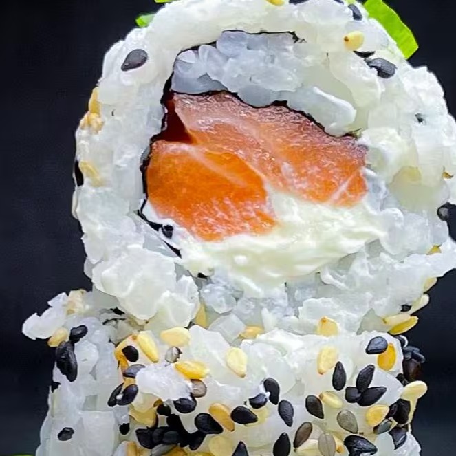 Makimono enrolado com arroz por fora e recheio de salmão fresco e cream cheese, finalizado com gergelin que realçam sabor e textura. - porção com 10 unidades Acompanha 2 molhos: teriaki e shoyu.